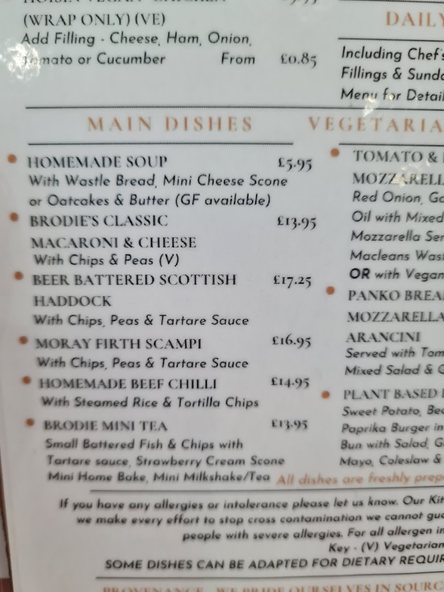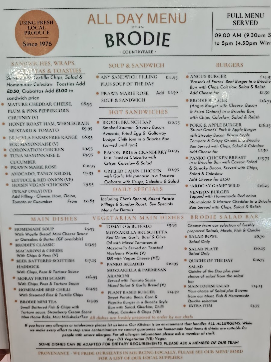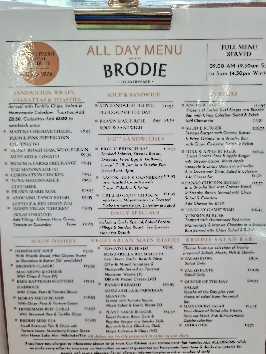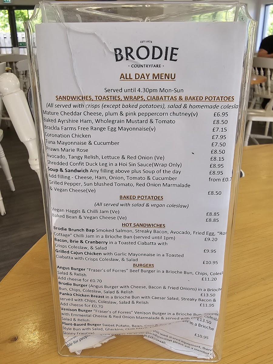 The menu features hearty options like the Brodie Burger and Fish and Chips, alongside lighter fare such as fresh salads and plant-based choices. For those looking for something a bit sweeter, baked goods like cream cakes, meringues, and the delightful Nutella doughnut fit perfectly with a cappuccino or afternoon tea experience. Seasonal highlights, including the Christmas Afternoon Tea, add a festive note during the holidays, inviting visitors to relax in a warm, welcoming atmosphere.